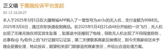 2025年3月5日,河北消费者刘先生通过大疆商城APP购买了一台型号为Air3S的无人机,金额为9988元。在5月4日21时48分的一次飞行中,无人机在郊区突然失控坠落,坠落过程中还撞击电线,导致机身多处损伤。据刘先生提供的DJI Fly软件飞行记录左下角显示,无人机高度一直在不停下降。次日,他联系大疆客服反映问题,要求解决。