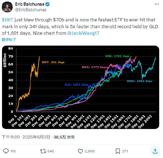 分析师Eric Balchunas在社交平台X上写道,在上市341天(交易日?)后,IBIT达到这一纪录,“比GLD保持的1691天的旧纪录快了5倍”,他指的是资产管理公司道富银行(State Street)著名的黄金ETF。