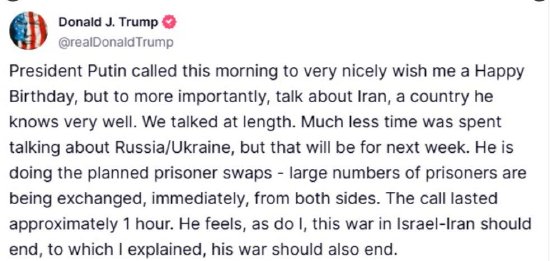 特朗普写道:“通话持续了大约1小时。他和我都认为,以伊之间的这场冲突应该结束,对此我回应称,他的也应该结束。”