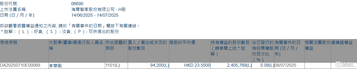 格隆汇7月14日丨根据联交所最新权益披露资料显示,2025年7月8日,海尔智家(06690.HK)获执行董事兼董事长李华刚在场内以每股均价23.55港元增持9.42万股,涉资约221.84万港元。