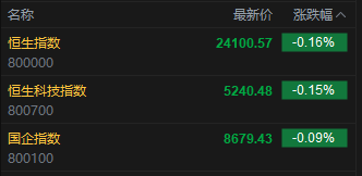 今日港股三大指数集体低开,恒生指数跌0.16%,报24100.57点,恒生科指跌0.15%,国企指数跌0.09%。盘面上,科网股涨跌不一,百度集团、哔哩哔哩、京东集团跌超1%,快手涨0.55%;中资券商股大涨,国联民生涨超14%;黄金股普涨,中国白银集团涨超12%;创新药概念多股上涨,药明合联涨超3%。