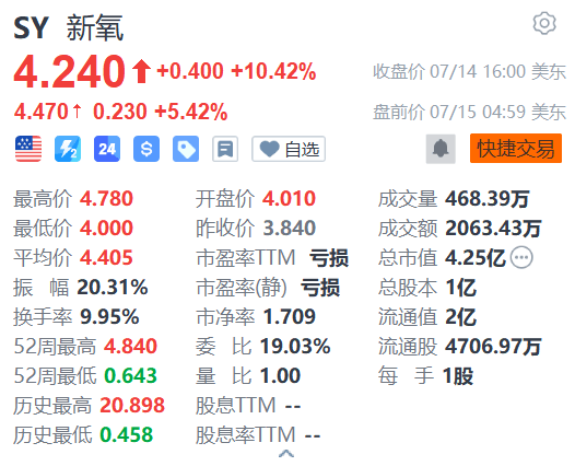 新氧美股盘前续涨超5%,昨日盘中股价创近4年新高!7月以来续涨约37%,年内股价已飙升4.3倍