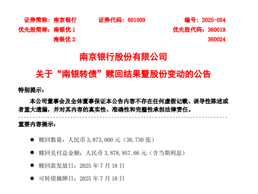 7月18日,南京银行公告,其发行的“南银转债”实现强赎转股,正式从上交所摘牌。
