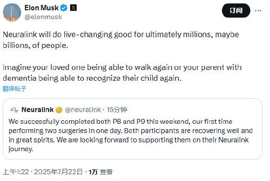 Neuralink首次一天内完成两台手术 马斯克:脑机将改变数百万人的生活