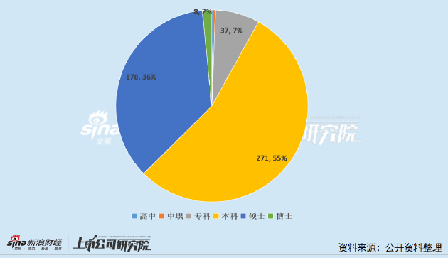 从CFO的学历分布看,拥有高中、中职、专科、本科、硕士、博士的CFO数量分别为1人、2人、37人、271人、178人和8人。其中,本科、硕士学历CFO占比最高,合计占比超90%。三名学历最低的CFO分别为海森药业的潘爱娟(高中)、千金药业的彭意花(中职)、盘龙药业的祝凤鸣(中职)。