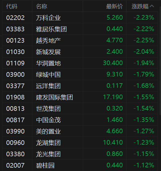港股内房股普遍走低,其中,万科企业、新城发展、越秀地产、雅居乐集团跌超2%,华润置地、远洋集团、绿城中国跌约2%,世茂集团、中国金茂、龙湖集团、龙光集团、碧桂园跌超1%。