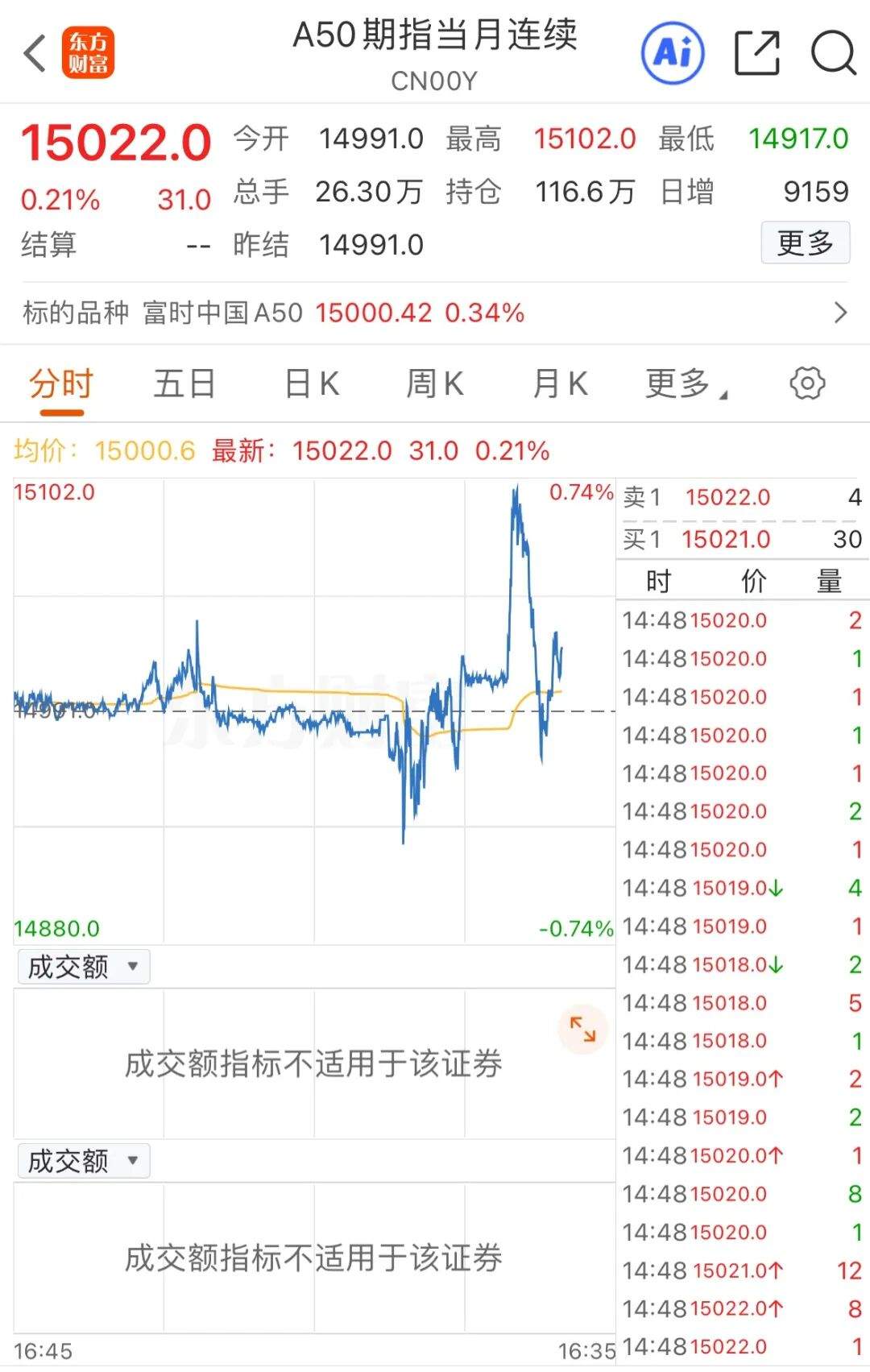 A50于午后直线拉升,明显强于全A股指数。