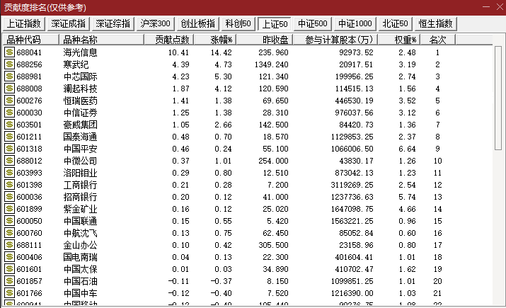 A股科技股亦同步走强,海光信息因利好传闻大涨超14%,GPU概念午后加速上攻,中科曙光(603019)强势封板,寒武纪短线拉升4%;中芯国际A股一度涨超6%,报128.78元/股,股价再创新高。科创50一度涨超4%。在此过程当中,恒生科技指数亦有显著反弹。从指数上涨贡献来看,海光信息、寒武纪、中芯国际对上证50的贡献最大。