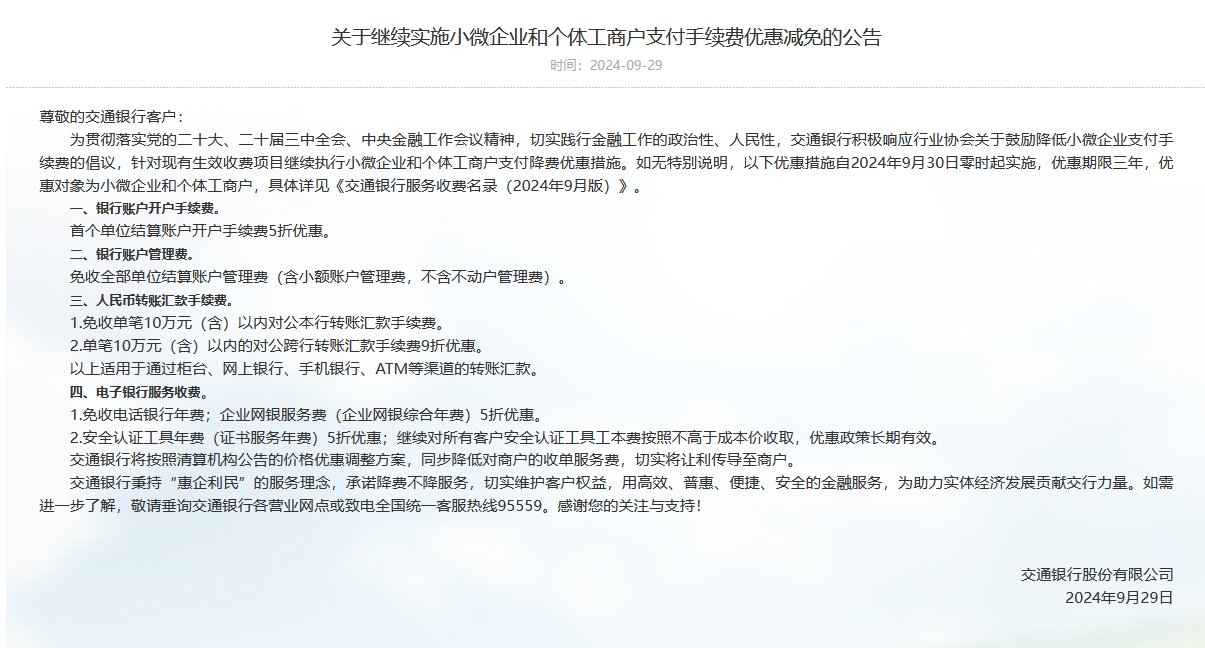 主要商业银行、支付机构和清算机构纷纷响应倡议。其中,工商银行、农业银行、中国银行、建设银行、交通银行、邮储银行国有六大行以及中国银联均将优惠期限延长三年。各股份行也纷纷跟进,其中,招商银行发布公告称将优惠期限延长三年,平安银行发布公告称将持续降费让利,具体优惠政策和执行日期以官网公告为准。