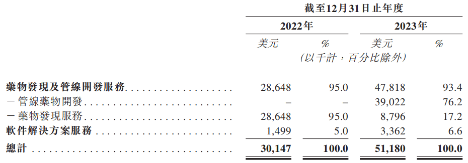 今年3月27日,英矽智能向港交所递交招股书,拟在香港主板IPO上市。招股说明书显示,公司的收入由“药物发现及管线开发服务”“软件解决方案服务”两大部分组成,其中前者2023年收入占比高达93.4%,且其下属的“管线药物开发”实现收入3902.2万美元,在总收入中占比76.2%。