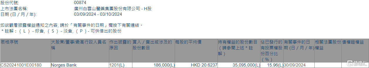白云山(00874.HK)遭Norges Bank减持18.6万股