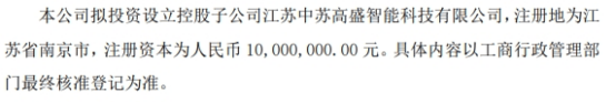 中苏科技拟投资设立控股子公司江苏中苏高盛智能科技有限公司 注册资本1000万