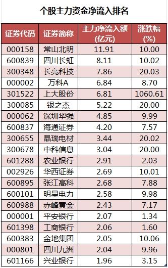 个股来看,今日有1798个股获主力资金净流入,其中,51股获主力资金净流入超1亿元。常山北明主力资金净流入最多,净流入金额为11.91亿元;主力资金净流入居前的个股还有四川长虹(600839)、长亮科技(300348)、万科A、上大股份、银之杰(300085),净流入金额分别为8.11亿元、7.86亿元、6.84亿元、6.81亿元、5.22亿元。