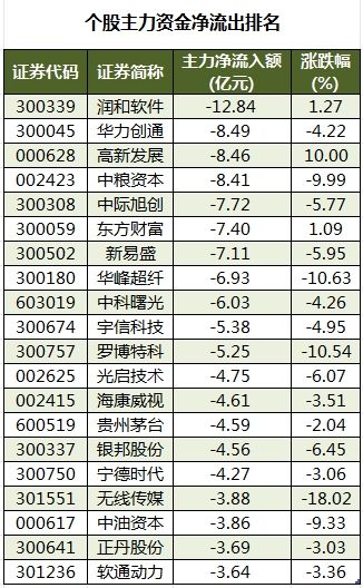 今日有3290只个股被主力资金净卖出,其中,102股被主力资金净卖出超1亿元。主力资金净流出最多的个股是润和软件,净流出金额为12.84亿元;主力资金净流出居前的个股还有华力创通(300045)、高新发展、中粮资本、中际旭创(300308)、东方财富,净流出金额分别为8.49亿元、8.46亿元、8.41亿元、7.72亿元、7.4亿元。