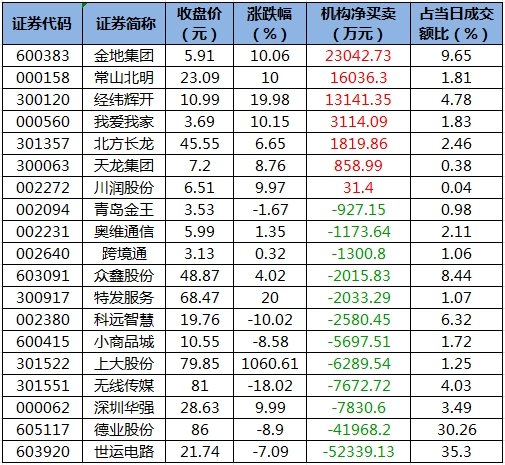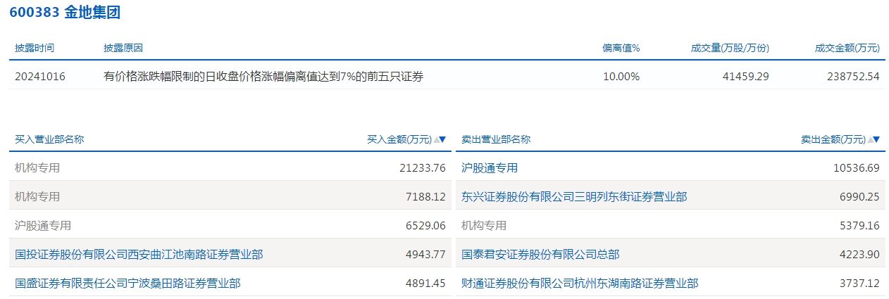 龙虎榜机构净买入7股 金地集团(600383)居首