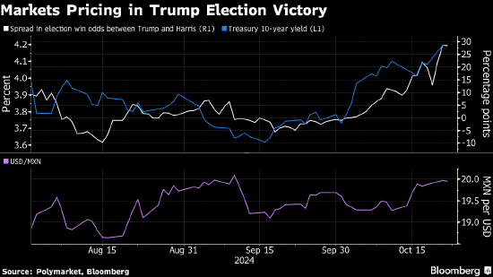 美国国债和墨西哥比索走势似乎正在反映特朗普赢得美国总统大选的可能性上升。