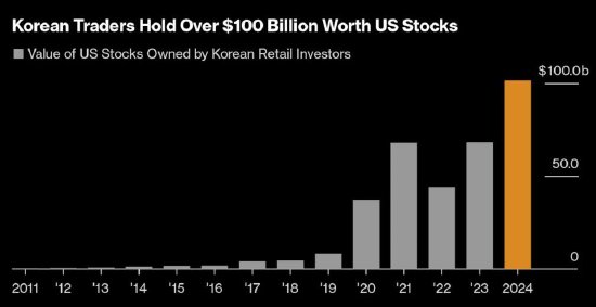 随着对大型科技股和杠杆基金的兴趣日益浓厚,韩国散户投资者持有的美国股票规模首次突破1000亿美元。