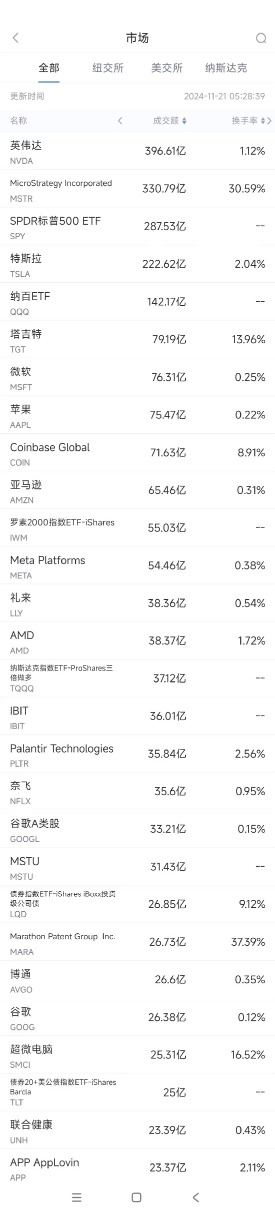 11月20日美股成交额前20:比特币概念股MicroStrategy市值突破1000亿美元