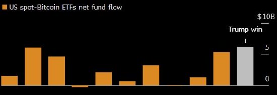 十几个美国比特币交易所交易基金(ETF)的月度净流入迈向创纪录水平;受当选总统特朗普对加密货币的拥抱,比特币迈向10万美元。