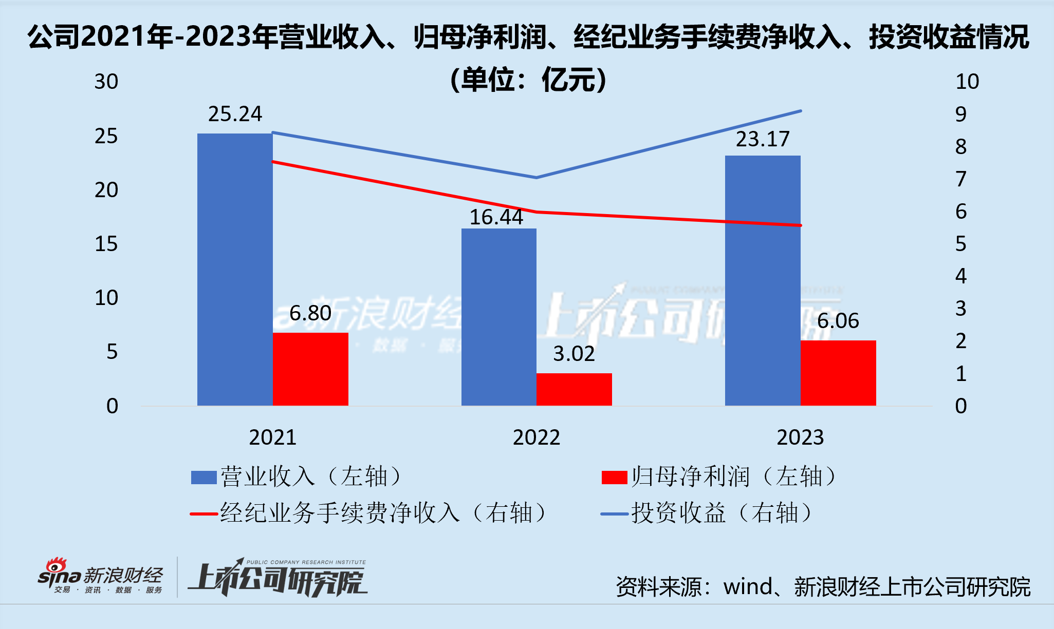 而经纪业务和自营业务的业绩表现非常依赖市场行情,使得公司业绩“忽高忽低”的情况并未得到太大改善。2021-2023年,公司营业收入分别为25.24亿元、16.44亿元、23.17亿元,归母净利润分别为6.80亿元、3.02亿元、6.06亿元。与此同时,同期公司经纪业务手续费净收入和投资收益也走出“V”字型业绩。