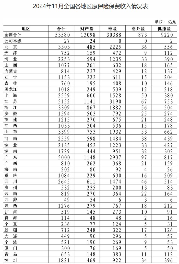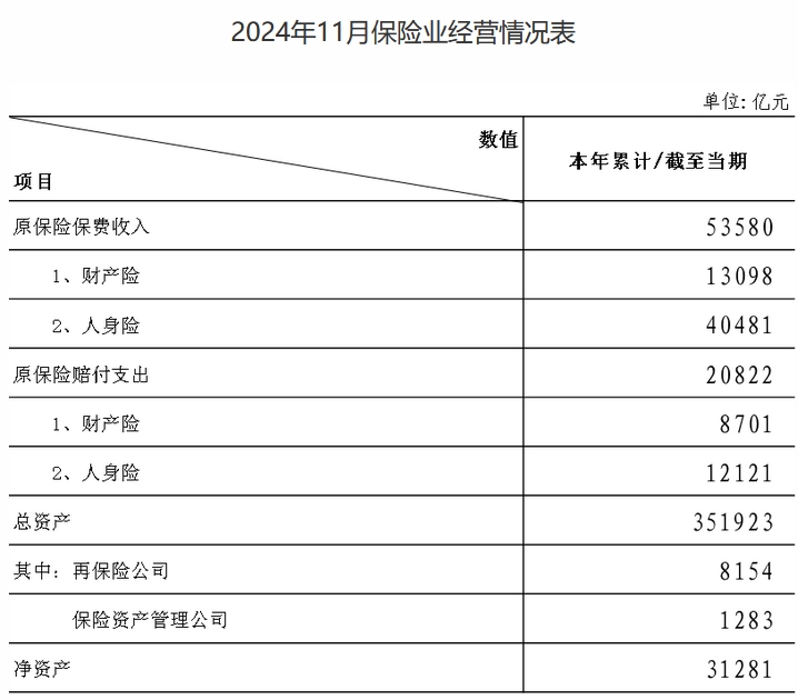 金融监管总局披露保险业经营情况 前11月原保险保费收入5.36万亿元