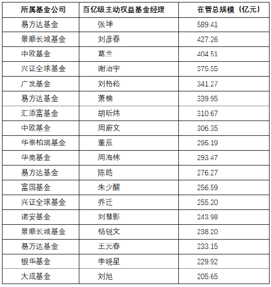 其中,仅易方达基金张坤管理规模超过500亿元,是唯一一位500亿级基金经理;景顺长城基金刘彦春、中欧基金葛兰管理规模超过400亿元;兴证全球基金谢治宇、广发基金刘格菘、易方达基金萧楠、汇添富基金胡昕炜和中欧基金周蔚文管理规模均超过300亿元。