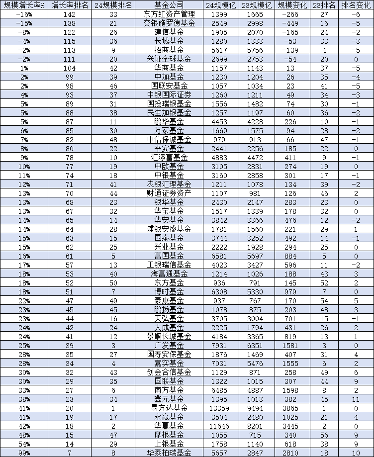 近日,基金公司2024排名出炉,华商基金规模小幅增长,华商基金2024年末规模为1156.7254亿元,2023年末为1143.3191亿元,规模变化为13.4063亿元,规模增长率为1.17%,在增长率排名中排在第104位。其规模排名从2023年的37位下降至2024年的42位,下降了5位。