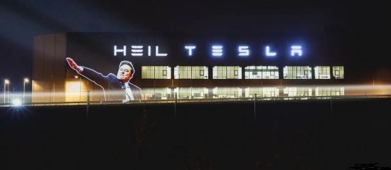 当地时间周四晚上,这个投影出现在位于柏林郊区的特斯拉工厂的外立面上,上面还有一个德语单词“Heil”,这与旁边特斯拉公司的名字连在一起,形成了“Heil Tesla”这个短语,构成了对“Heil Hitler”的一种模仿。