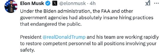 马斯克评论称:“在拜登执政期间,FAA(美国联邦航空管理局)和其他政府机构的雇佣行为绝对是疯狂的,危及了公众利益。唐纳德·特朗普总统和他的团队正在迅速恢复称职的人员到所有涉及你的安全的岗位。”