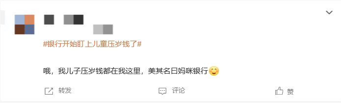 还有作为家长的网友评论称:“我儿子压岁钱都在我这里,美其名曰妈咪银行。”