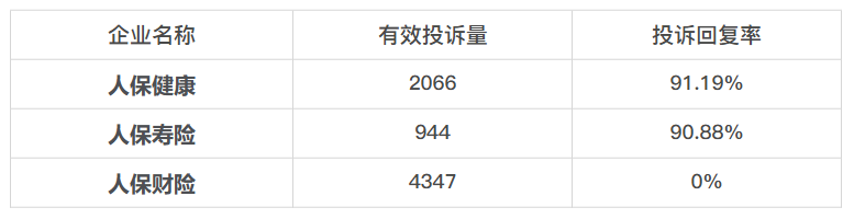 其中人保健康的回复率为91.19%、人保寿险的回复率为90.88%,投诉处理比较积极;而人保财险还未对平台上的用户反馈做出回应,回复率为0%。