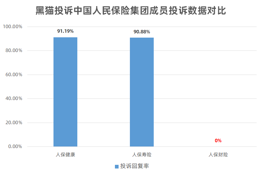 黑猫投诉中国人民保险集团成员投诉数据对比:人保财险投诉回复率为0%