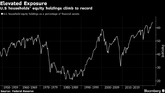 问题在于,近年来,市场上涨在美国人的富裕感中发挥了巨大作用,有助于支撑消费。美联储的数据显示,去年,持股占美国家庭金融资产的64%,创下纪录高点。