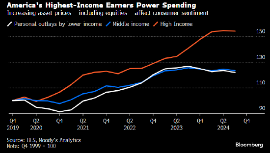 穆迪首席经济学家Mark Zandi指出,当今的商业周期,美国最富有的10%家庭几乎占全国消费支出的一半,并拥有一半的股票,价值约23万亿美元,因此市场财富减少带来的威胁是真实存在的。他估计,净资产每减少1美元,消费者支出最终就会减少2美分。