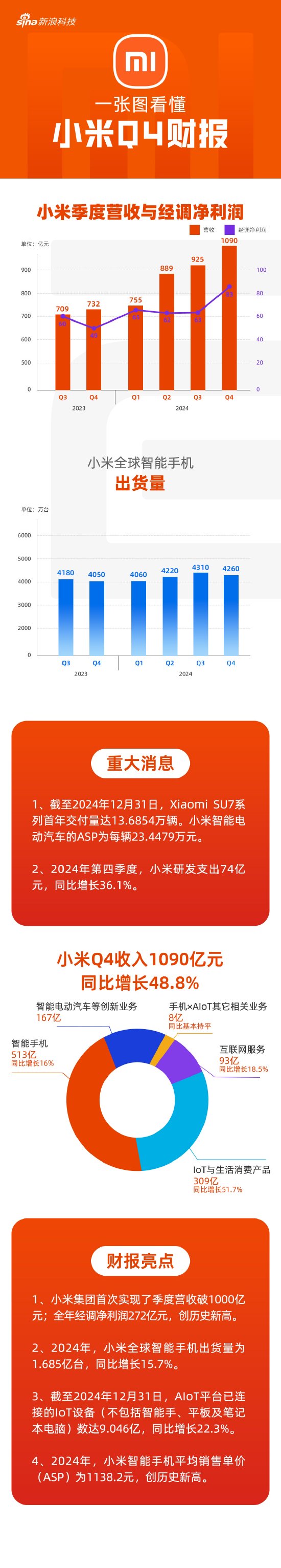 小米集团发布2024年第四季度及全年财报:四季度营收1090亿元,首次实现季度营收破1000亿,同比增长48.8%。其中,手机×AIoT营收923亿(智能手机513亿+IoT与生活消费产品309亿+互联网服务93亿+其它8亿),智能电动汽车等创新业务营收167亿。2024全年经调净利润272亿元,创历史新高。截至去年底,小米SU7系列交付量达136854辆,小米智能电动汽车平均销售单价(ASP)为23.4479万元。