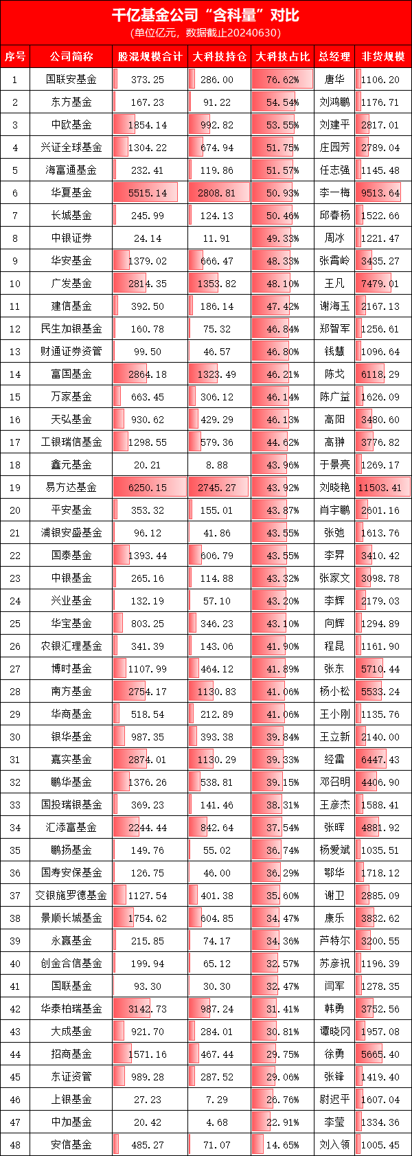 根据Wind数据,截至2024年6月30日,非货规模超过千亿的基金公司共有48家。这些基金巨头在大科技领域的布局和“含科量”情况备受瞩目。在这场“含科量”的比拼中,不同基金公司的表现差异显著。