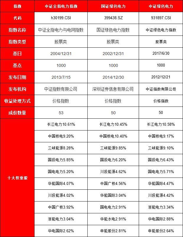 中证全指电力指数(H30199.CSI):覆盖传统电力企业,成分股包括长江电力、华能国际等龙头。跟踪该指数的ETF有广发基金电力ETF(159611.SZ)、华泰柏瑞基金电力ETF(561560.SH)等,适合看好传统电力板块的投资者。
