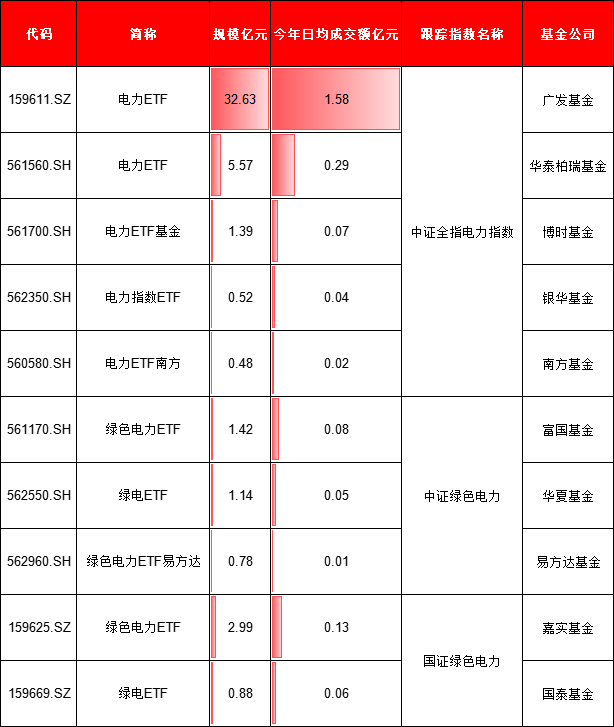 广发基金电力ETF(159611.SZ)以32.63亿元规模、1.58亿元日均成交额稳居榜首,流动性最优,适合大资金进出。