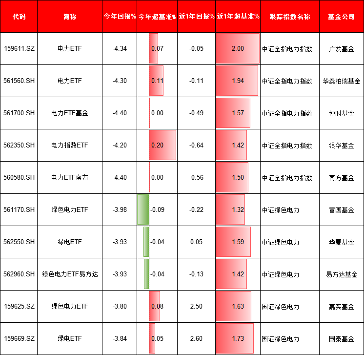 尽管今年电力板块整体回调,部分ETF仍跑赢基准: