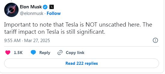 特斯拉CEO埃隆·马斯克在社交平台X上回应一位网友关于关税的帖子时表示:“值得注意的是,特斯拉并非毫发无损。关税对特斯拉的影响仍然很大。”
