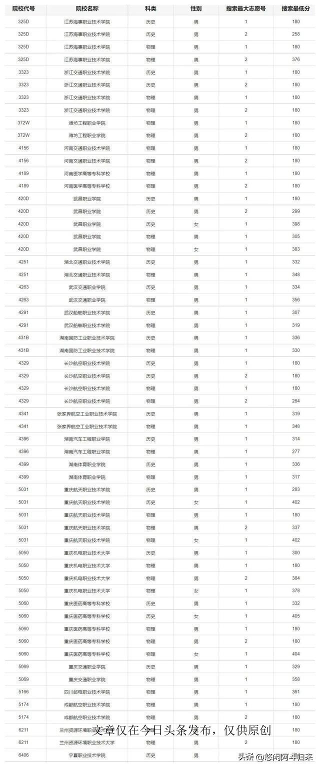 再看看重庆,包括江苏海事职业学院在内的物理男生最低录取分为180分,浙江交通职业技术学院、河南医学院。对于物理女生来说,最低录取分是378分,进了重庆机电职业技术大学重庆机电职业技术大学。历史上的男孩和女孩也分别有录取分数线。