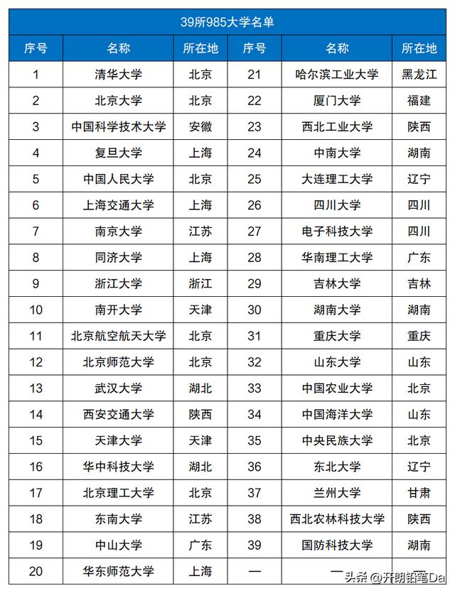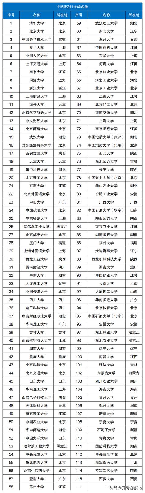 根据不同的工程院校计划,小编分别统计了985、211所大学的名单,具体信息如下: