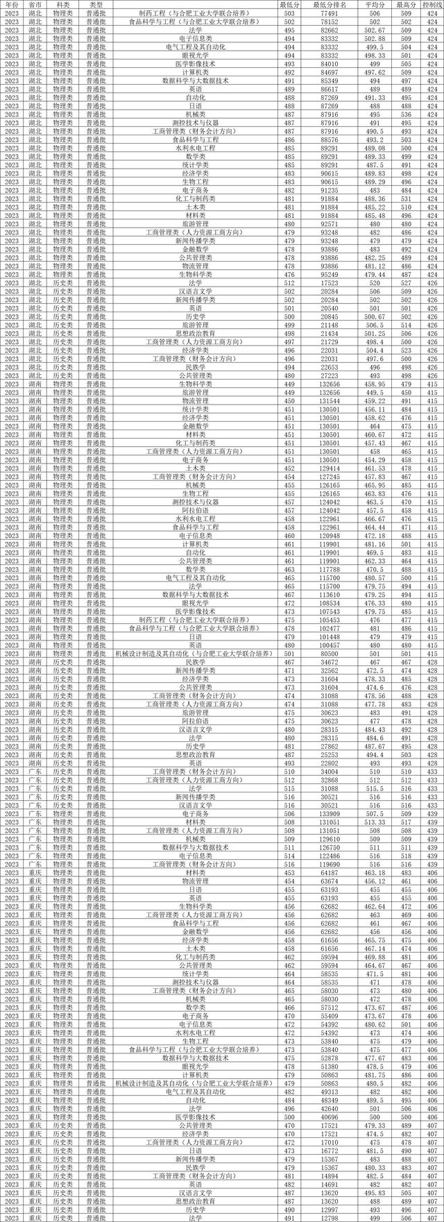 湖北本科批物理录取分数线较高的专业:制药工程(与合肥工业大学联合培训)503分,食品科学与工程(与合肥工业大学联合培养)502分,法学495分,生物科学最低分476分,最低分95249分。