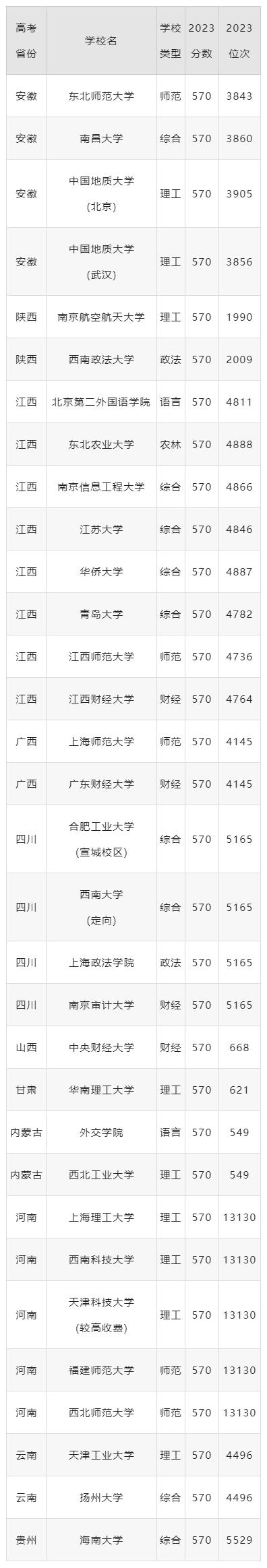 收集编辑的来源安徽、陕西、江西、广西、河南在传统高考地区,2023年高考录取情况列出了570分文科考生可以进入的公立本科大学。准备参加2024年高考的学生可以参考下表选择合适的学校。