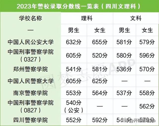 理科:2023年,四川理科招生共有6所警校,录取分数最低的男生是中国刑警学院2023年0827年投档线为540分。此外,还有分数较低的郑州警察学院(541分)、四川警察学院(552分);中国刑警学院0327年,2023年的投档线为520分,女生录取分数最低。此外,还有分数较低的郑州警察学院(541分)、
