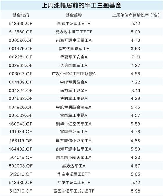资金的涌入不仅提振了个股的走势,也拉动了主题基金的净值。上周军工主题基金平均涨幅约为5.3%,重仓低空经济、商业航天等概念的华夏军工安全基金上涨9.22%,长信国防军工与中邮军民融合均涨超7%;ETF份额方面,国泰中证军工ETF增超8400万份,易方达中证军工ETF增长3700万份。